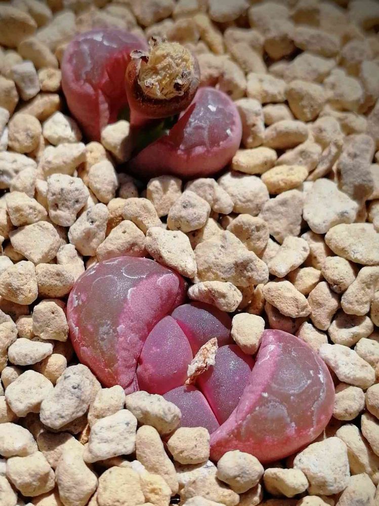 昨日のフェネストラリア属と自生地が重なっている、Lithops optica 'Rubra'。去年の11月以来の登場になります。我が家では初めての夏越しに備えて、がっつり埋めました🤭