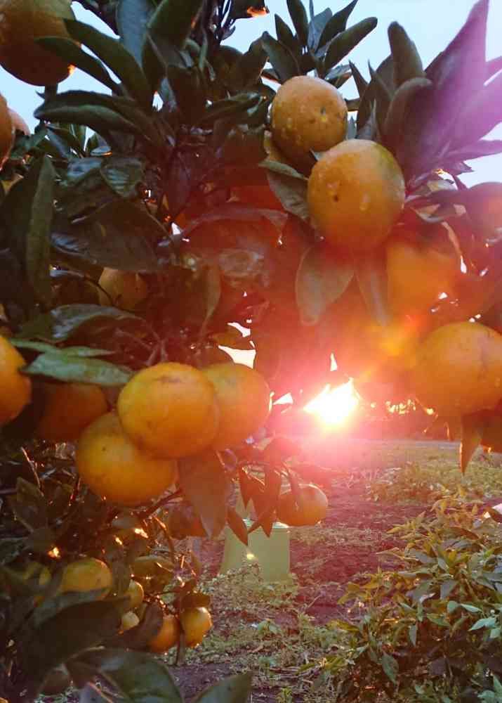 たくさん実ったミカン🍊と眩しいほどの夕日。