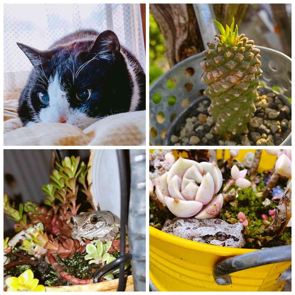 ねこさん、可愛いですね🌸 カエルさんは本物?