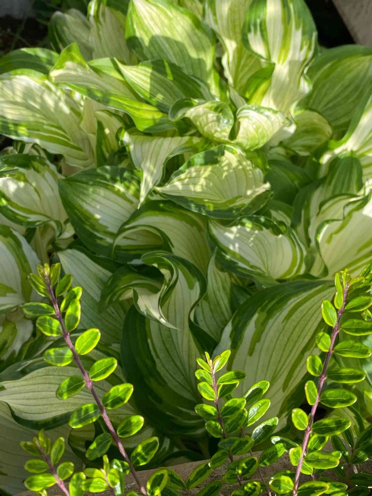 斑入りギボウシの葉っぱがわさわさと繁ってきました。この姿が一番美しいと思います。