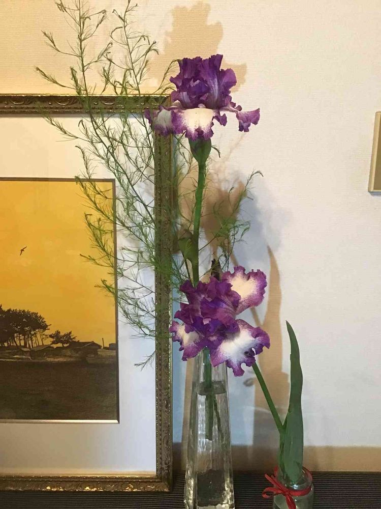 ただ ノッポな ジャーマンアイリスなので 、どうしよう〜かな⁇❓って 思いましたが、野菜のアスパラガスの 葉っぱ が、凄く 背が高く、伸び伸びと 伸びて来ていたので、そうだ‼︎ と、これを パッチン✂️して 添える事に しました❣️(╹◡╹)♡