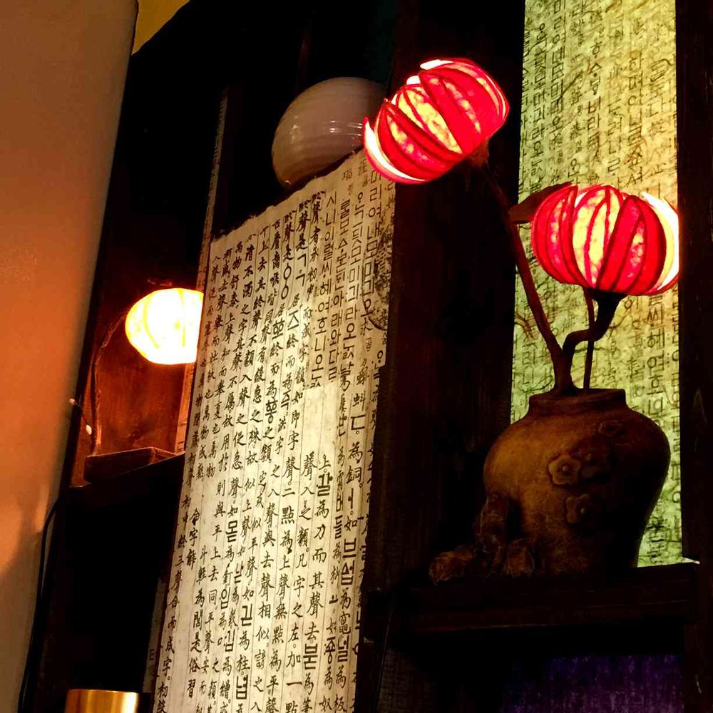 韓国語の後のランチ&お茶。お花の形をしたライト。ここは落ち着く〜。