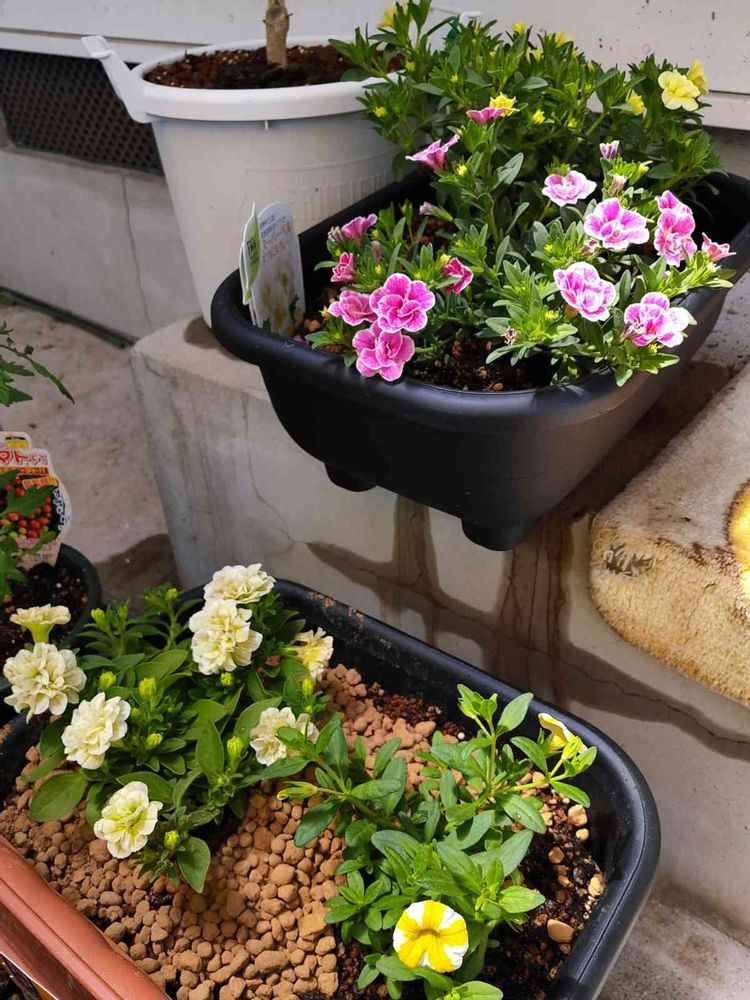 昼活です。カリブラコアとペチュニア、全ての株の花が咲き始めました。黄色のストライプやっぱり買って良かったなぁ。