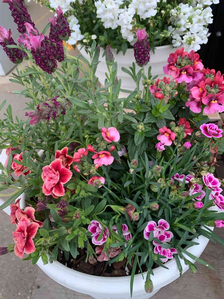 数あるフレンチラベンダーの中から、この色をチョイス✨前方にはかわいいナデシコ、ピンクキッス💕とミリオンベルの新色ストロベリーホイップ🍓です。