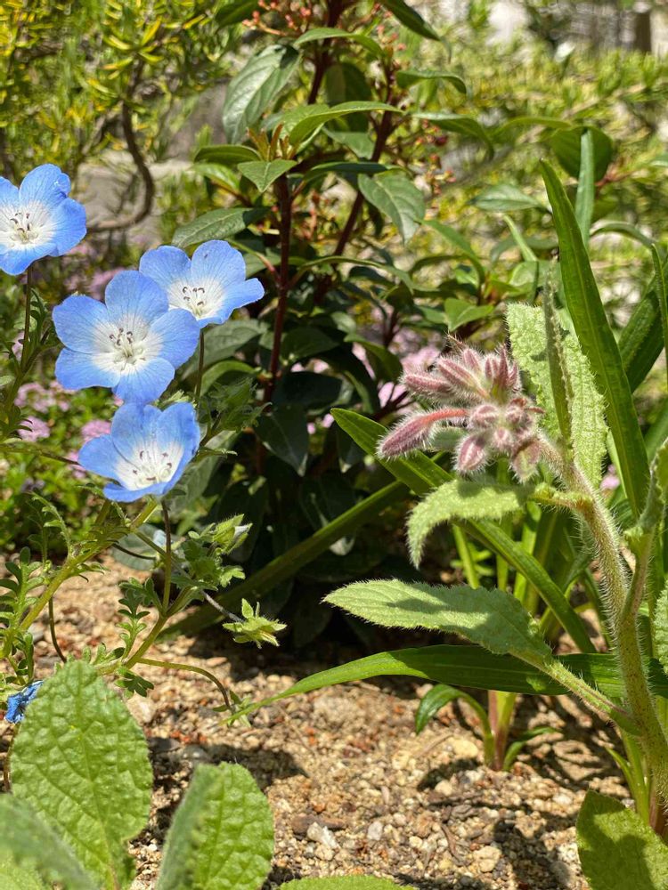 急に背丈を伸ばしたボリジ。それでもまだネモフィラより小さいです、頑張って開いてね!