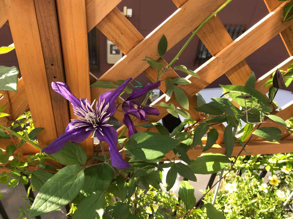 ラティスの下の方でクレマチス・ニューヘンダーソニーが咲きました