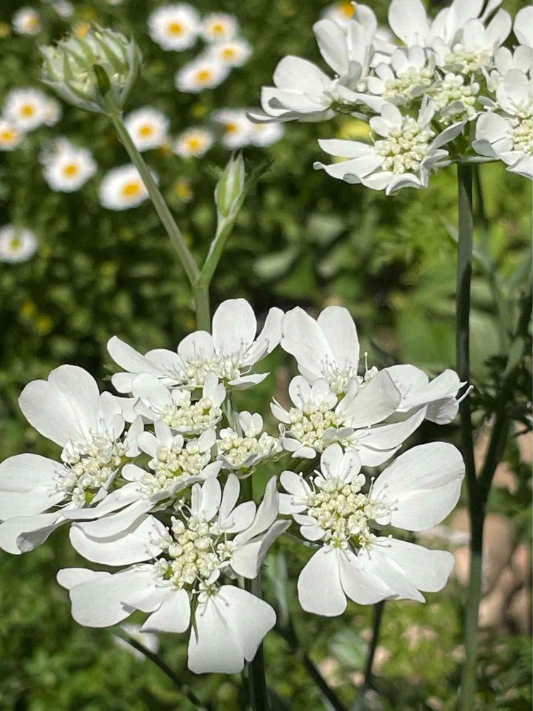 オルレアさん、初めて咲かせたよ🤍ご近所さんからこぼれ種の苗を頂いたの。