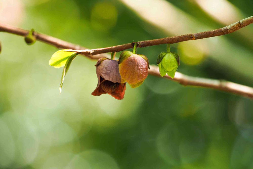 ポポーの花です。大中小の花が並んで咲いていました。柿とバナナとマンゴーが合わさったような🤔それほど濃厚では無い味の実がなります😊