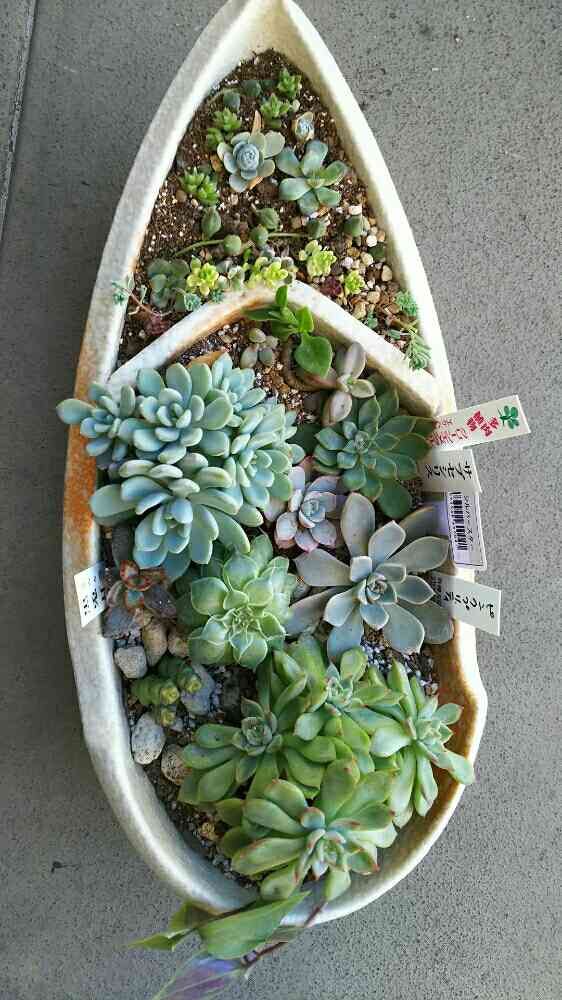 お船の形の器にたくさんの多肉ちゃんが入ってるなぁ😃