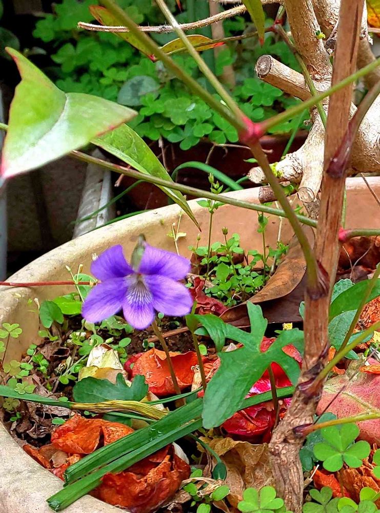 お隣さんの南天の鉢に勝手に生えて来たスミレ。