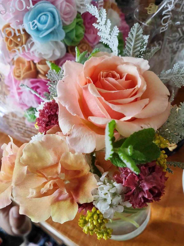 フレグラントアプリコットがきれいに咲いてくれたので、カットして花瓶へ。新苗で届いた時のつぼみが全部咲いたので、大きめの鉢に植え替えました。