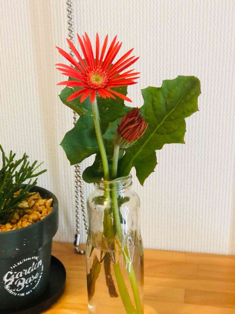 お隣さんに赤いガーベラの切り花を頂きました😌原種のガーベラだそう。日にちが経っても茎が曲がらないよう細い針金までくれたので早速玄関に飾りました💕