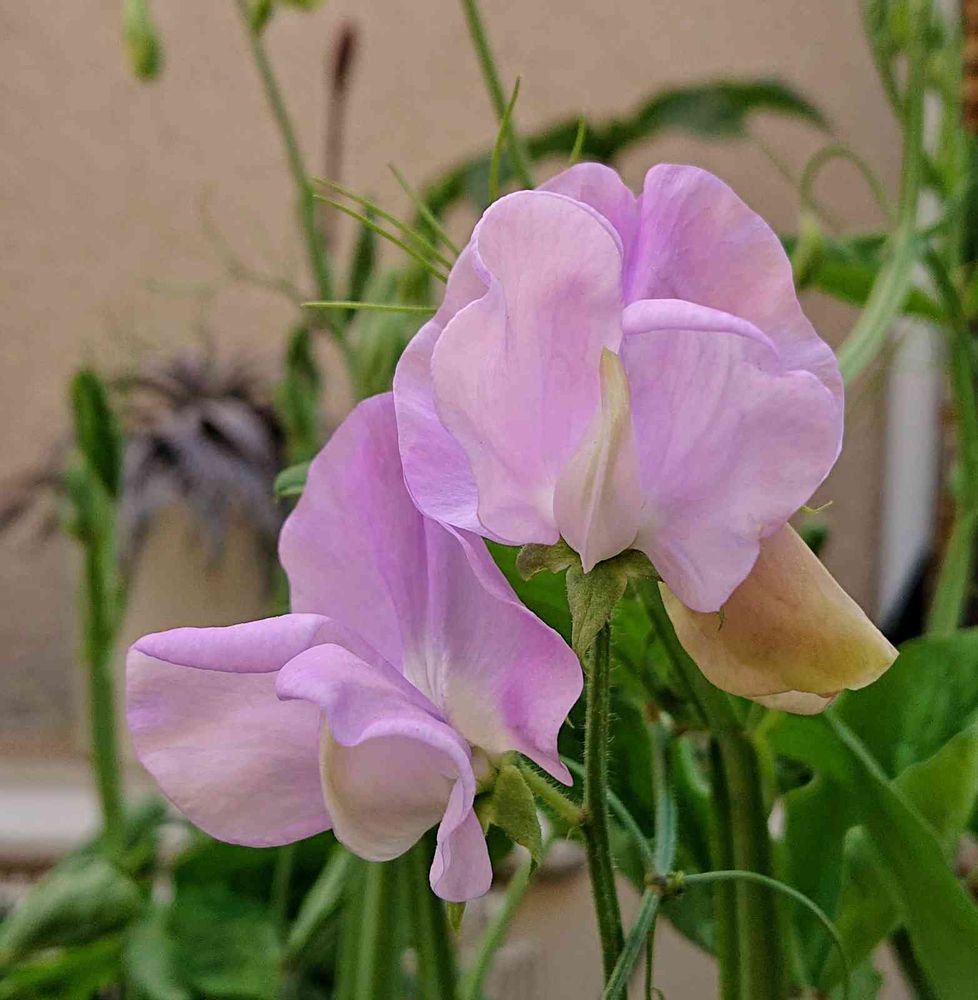 種で頂いたスイートピーが咲きました。ラベルには青、赤と書いてあったんですが、これは青の方ですかね。足して割った色に見えますね。😆