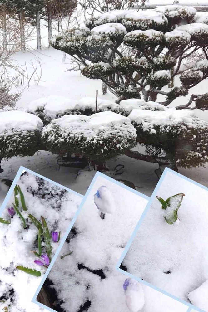 球根たちの蕾や葉っぱが雪に埋もれて可哀想です💦