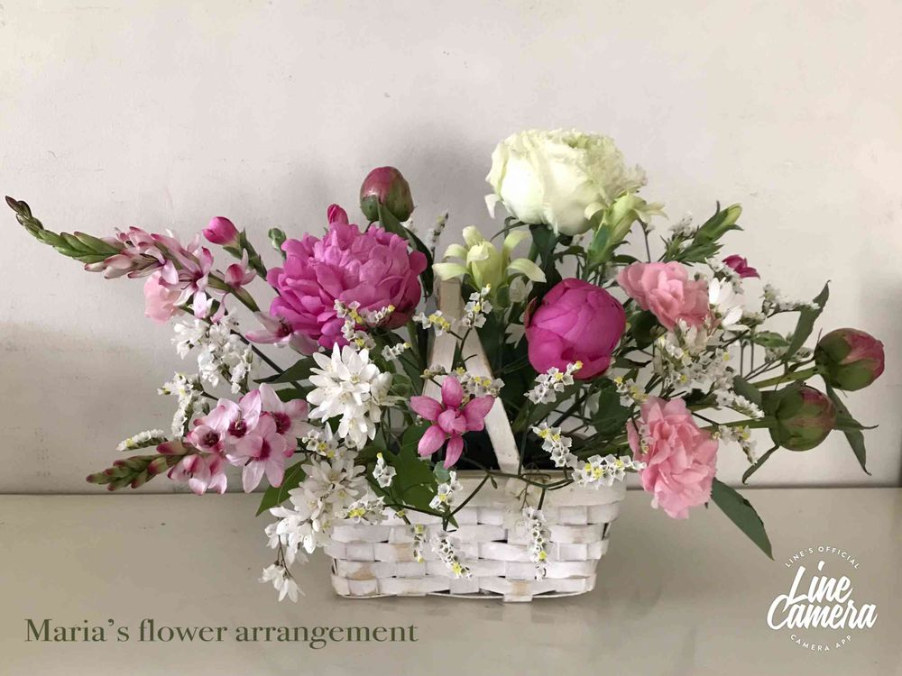 母はもういないけど、母の日を思って、カーネーション、シャクヤクを使って白いバスケットにアレンジ。