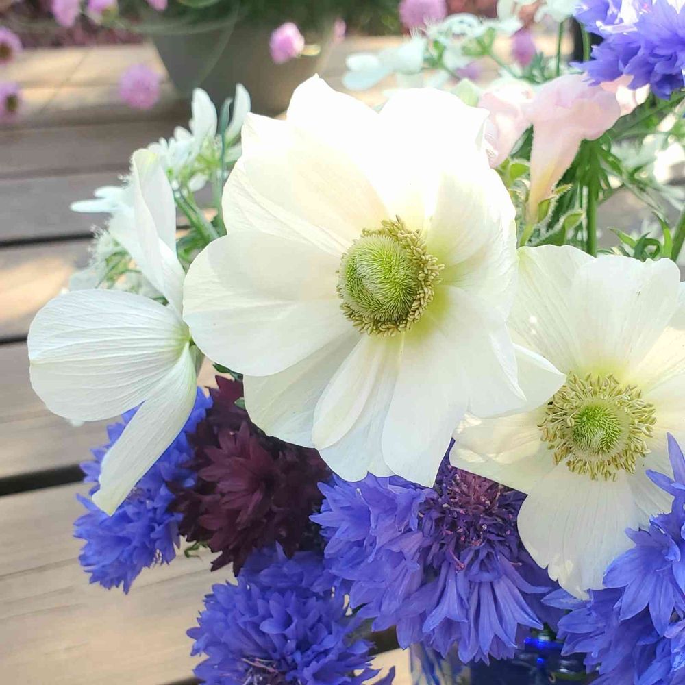 アネモネがだんだん小さくなり…矢車菊と合わせたらなかなか可愛くなりました😄💙🤍