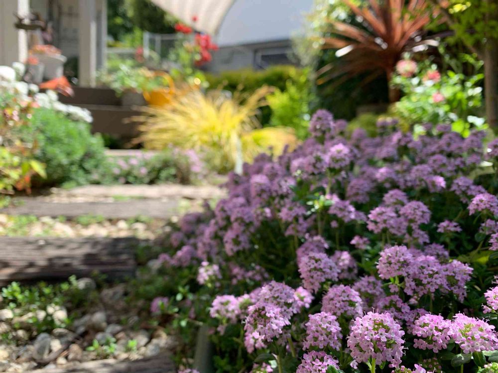 今年も我が家の小さな庭でタイムが満開になりました!枕木のステップ沿いにグランドカバーとして植えてあります。今日はミツバチが忙しそうに行ったり来たりしていましたよ(*´-`)