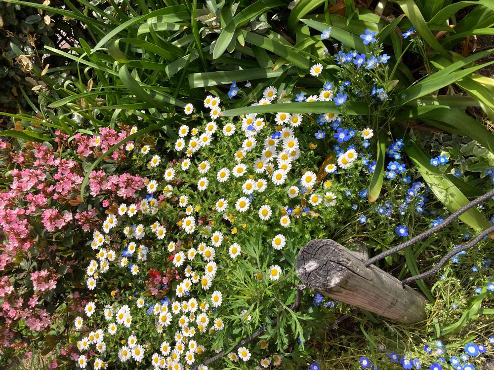 「白い花はノースポールです。私の家にも咲いてます。種が落ちて毎年咲きます。」かも!