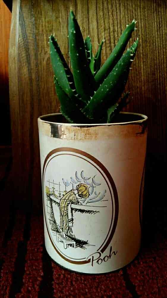 大好きなアロエを大好きなくまのプーさんの缶に植え替えました!アロエの品種は、不夜城です!