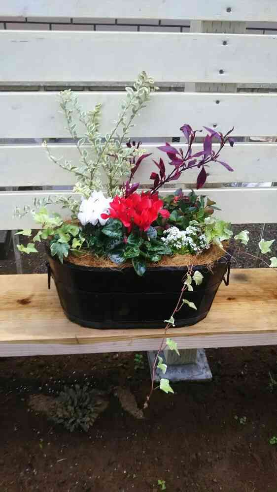 雨だけど、買ったままになってたガーデンシクラメンが可哀相なので、前に作ったリーフの寄せ植えを使って寄せ直ししました。