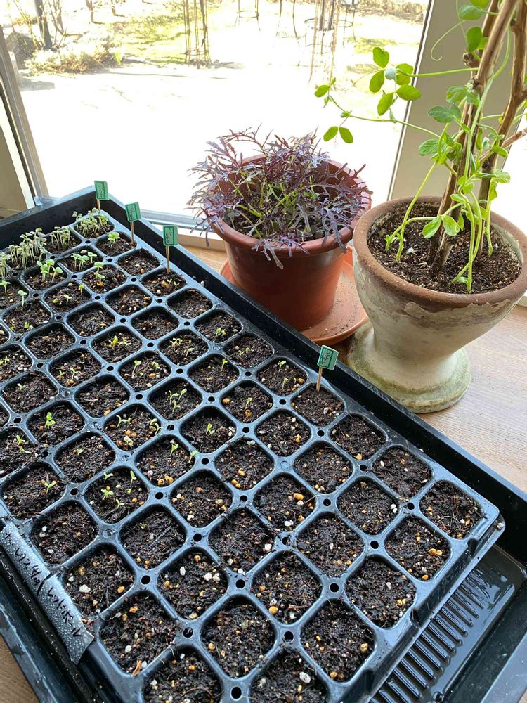 側にある茶色プラ鉢はアントシアニンリッチからし菜です。綺麗な紫でオリーブオイル、塩胡椒、パルメザンチーズで食べるのが好き🧡