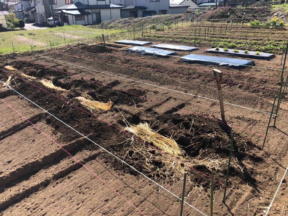6個目のマルチ畝とスイカ🍉畝に藁と堆肥と化成肥料を入れました。