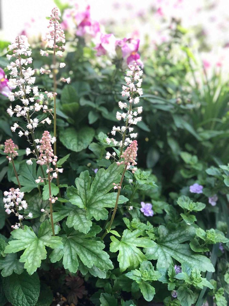 先程投稿した金魚草の寄せ植えの反対側。八重咲きバコパとヒューケラがひっそりと咲いて可愛い💕