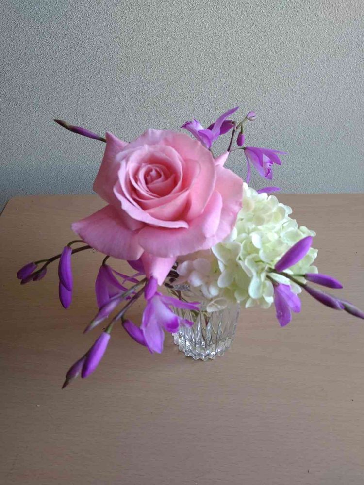 庭のバラ🌹と紫蘭とお隣さんにもらったオオデマリ😊