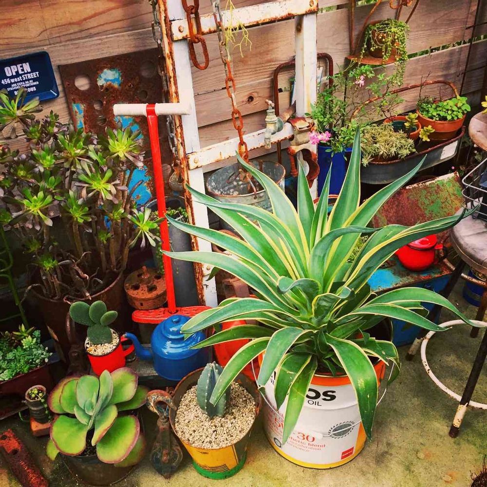 アガベのオイル缶に雨水が溜まっていたので捨てました。植え替えも暫く出来そうにないので植木鉢を入れて嵩上げしました。