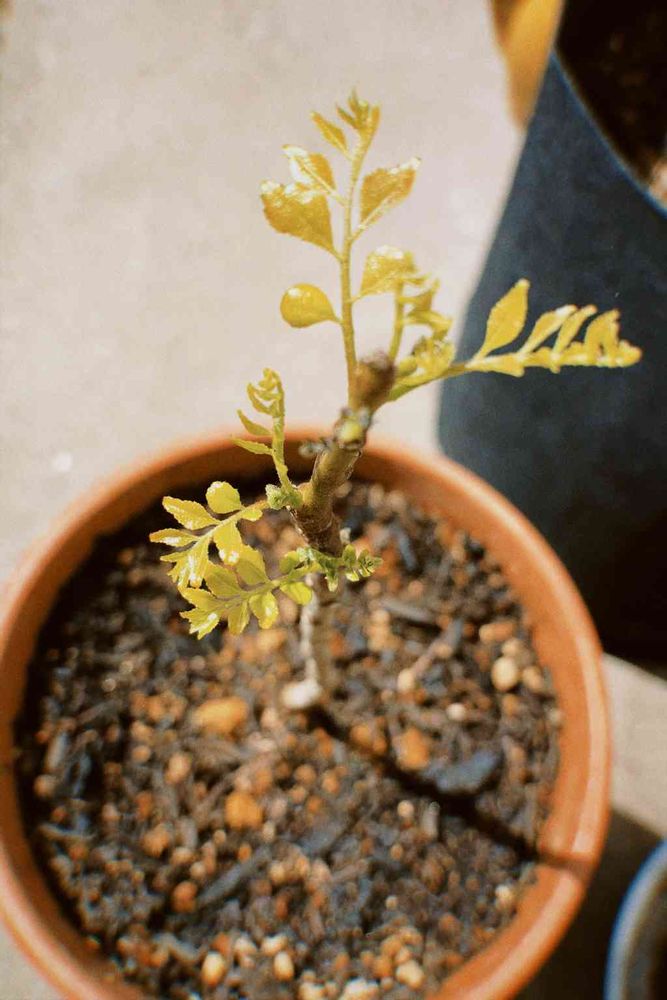 冬に寒さで変色してしまい、葉っぱを切り落としたカレーリーフに新芽が次々出てきました!