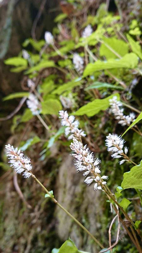 タデ科イブキトラノオ属の多年草。山地の林内に生える。高さ15~25㎝。根生葉は卵形または卵円形で長さ2~10㎝、先はとがり全縁、基部は長柄に流れる。花期は4~5月。花茎先端に長さ2~4㎝の花穂をだし白色の花をつける。花弁はなく、花弁に見える萼は5深裂し、雄しべ8個は突き出る。葯は赤色。花柱は3個で糸状。