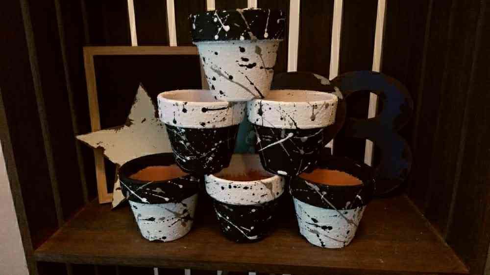 素焼き鉢を白黒で塗り分け、塗料を飛ばして風船ヨーヨーのように仕上げました!