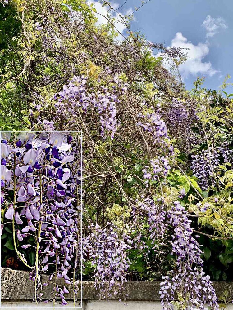 春の青空をしっかり掴んで、高くたかくへと、10数メートル以上もあろうか、ほふく(匍匐)しているフジ(藤)の大胆な風情をそこに観たのである。