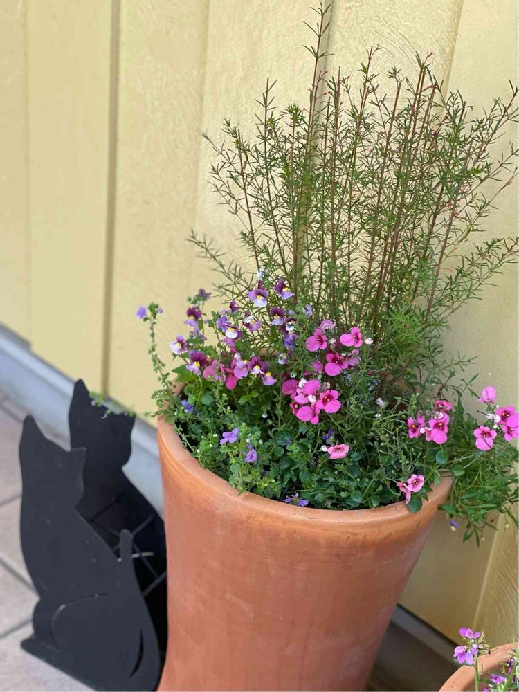 花が終わったボロニアヘテロフィラの植え替えをしようと調べたら、暑さ寒さ蒸れに弱いって💦 夏越し冬越しできるかな〜😆❓ 目が行き届くように、玄関前の寄せ植えに使ってみました♪ ボロニアの柑橘系の香りにバニラをプラス、PWネメシアもいれてみました💖