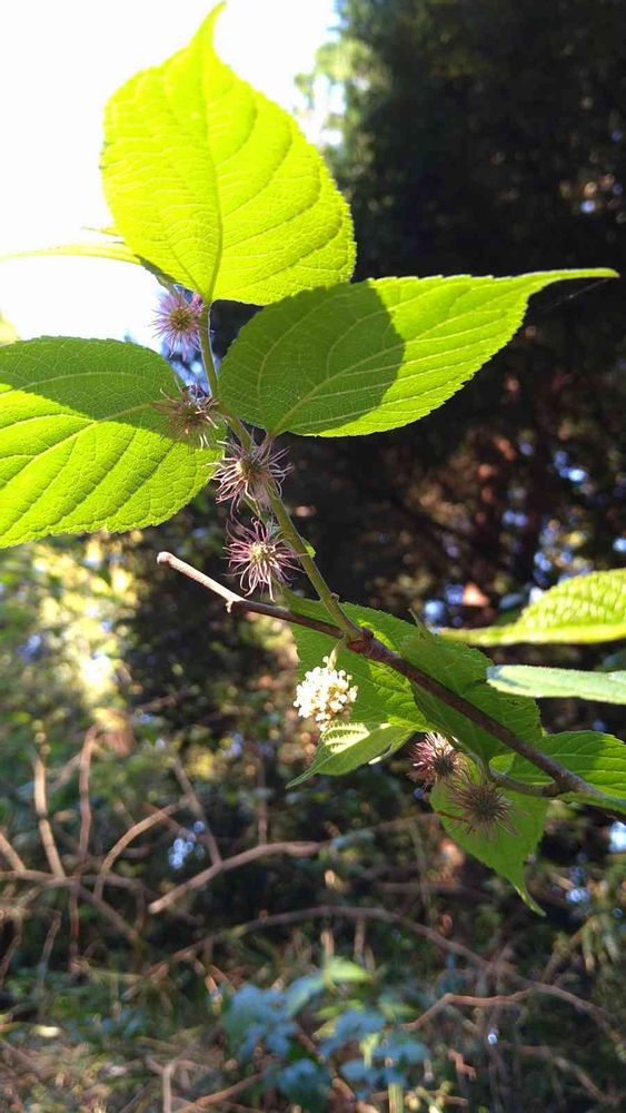 新枝の基部の葉腋に白いボンボリのように付いているのが雄花♡