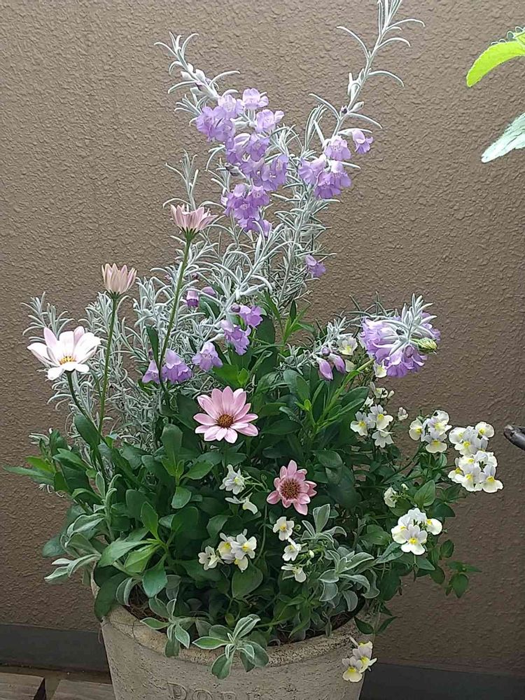 冬越しして、新しい土と少し大きい鉢にしてもらって、お花たちも生気を吹き込まれたんでしようね。すごく素敵な寄せ植え💓
