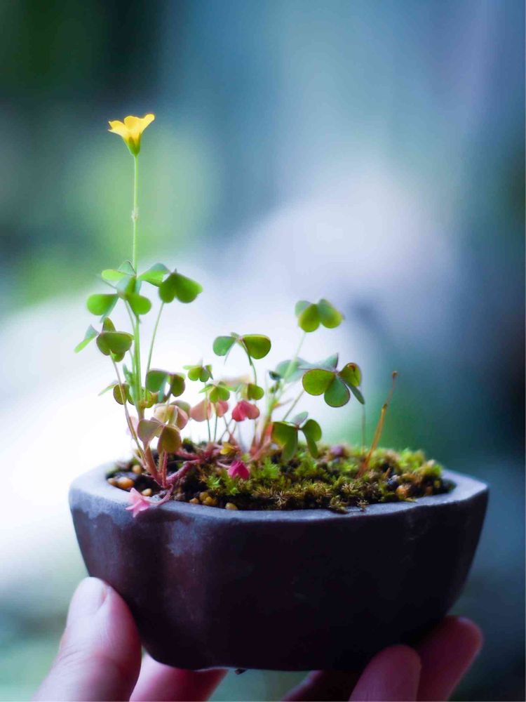 カタバミの葉っぱの閉じてるところが可愛いわあ❤️黄色のお花がまたいいアクセントになって素敵な鉢になってる😌