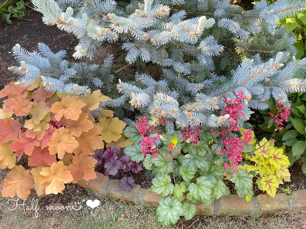 シルバーリーフのもみの木の足元、鮮やかなヒューケラが映えますねぇ🍀✨