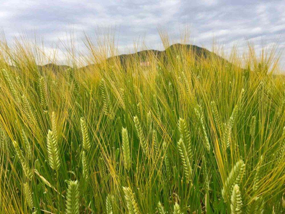 向こうに黒っぽく写る山影の手前に、穂先が黄金色に麦の穂? きれいな風景に撮れてますね。とても素敵です!