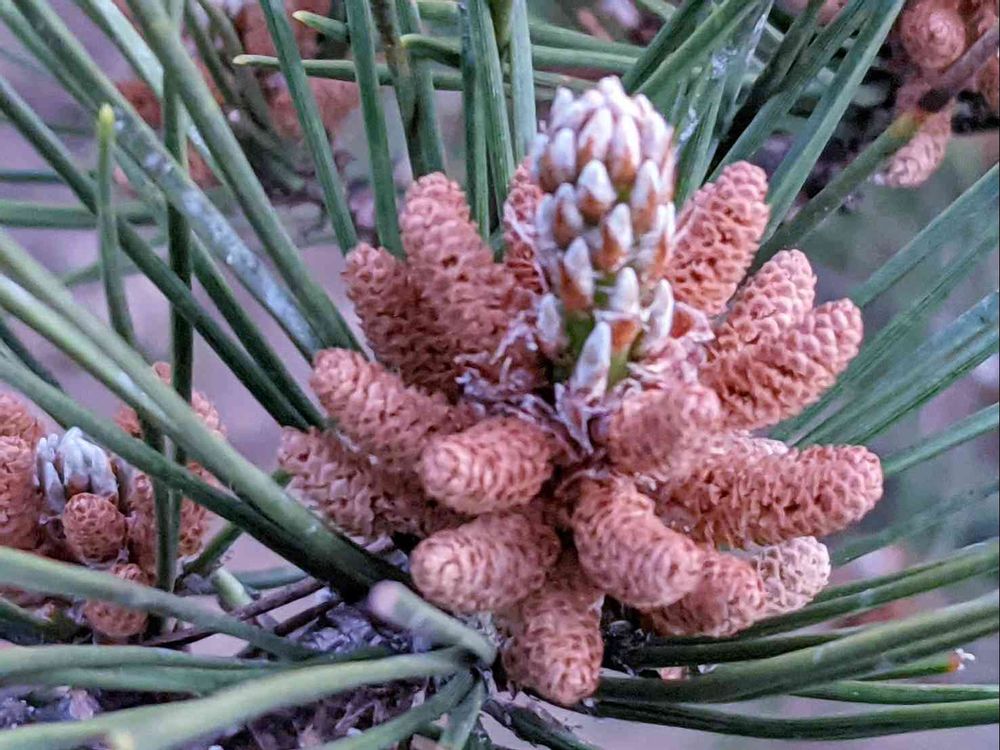 昨日写したお隣の松の木です。まだ新鮮で可愛いですが、これは雄花が開いて来た、という状態ですか…?🤔