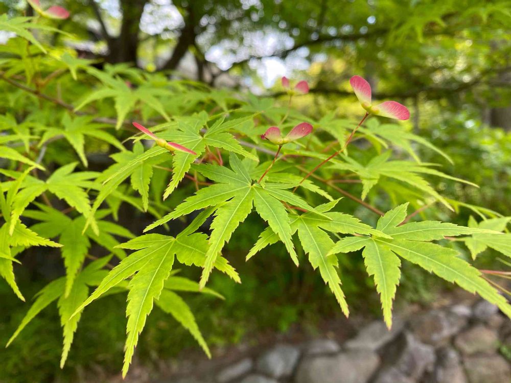 青いもみじの清涼感の中にピンクのプロペラ💗
