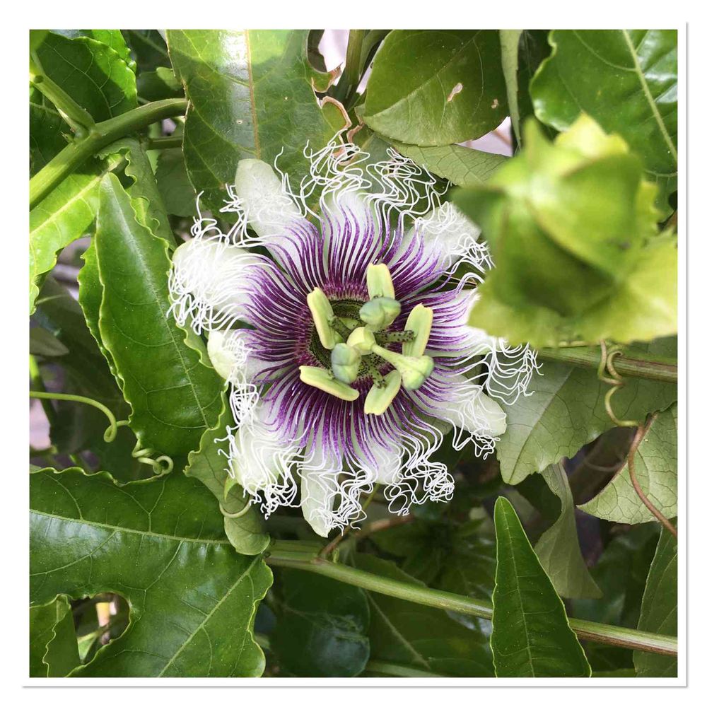 今年初のクダモノトケイソウの花。9:30ごろ咲いて、夕方にはしぼむ。受粉したので明日には小さなパッションフルーツの実ができ始める。