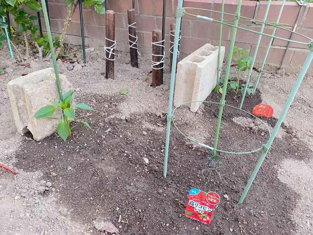 今年はトマト2種類とカラーピーマン(パプリカ)の赤を植えてみました。土には化学肥料じゃなくて知人からもらった熟成堆肥を混ぜ込みました。