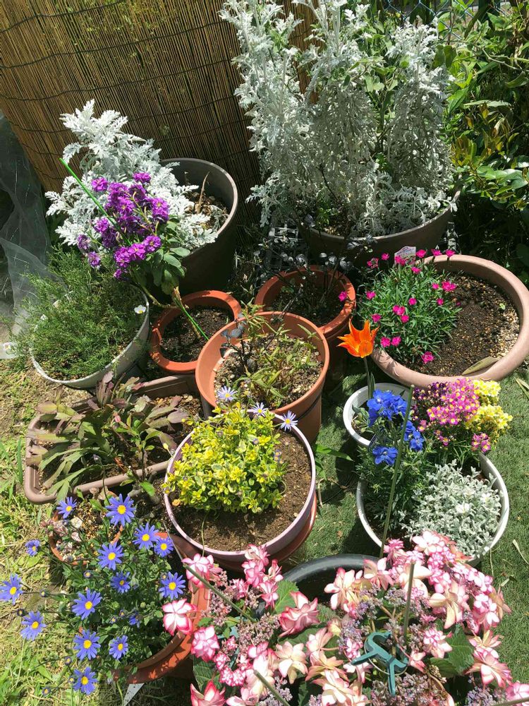 2021-4-24 (土)晴れ☀️ 🥲美しく青きドヨウに参加しようとベランダからブルーデイジー2鉢を持って来ました。途中班入りを落として😅慌てて植え替えました香りは年長さんのストックの甘い香りです🎶🐝〜蝶🦋〜