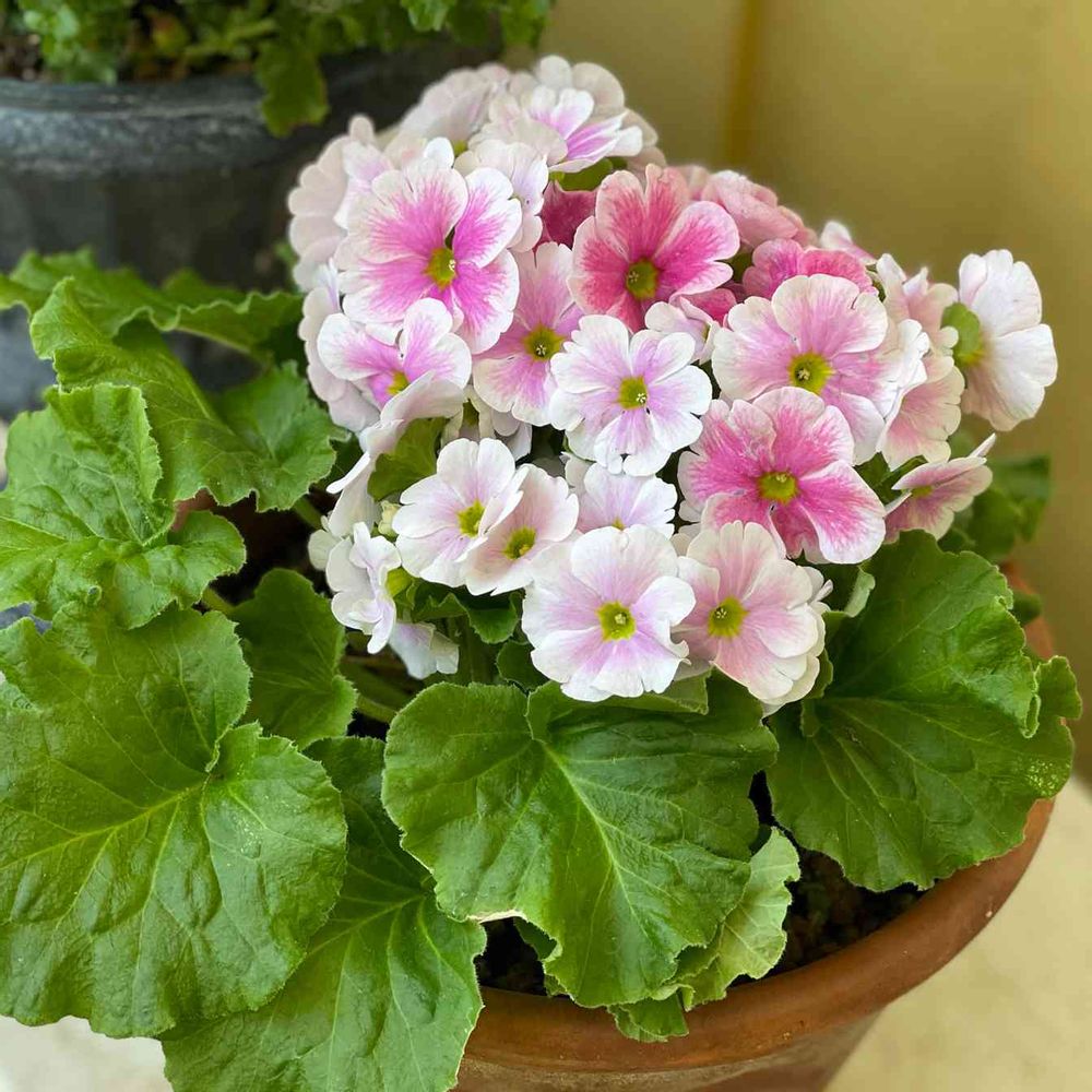 4月9日にプリムラオブコニカの二番花が咲いたという投稿をしたけれど、あれから花持ちよくゆっくりゆっくり咲き続けて、こんなに😆💖 まだ小さい蕾も見えます。明るい日陰で水多めの管理です。