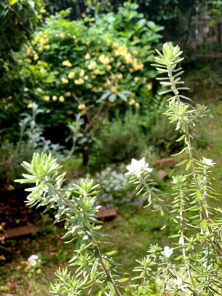 本日のお花。我が家のローズマリーは白い小さな花を咲かせてます。