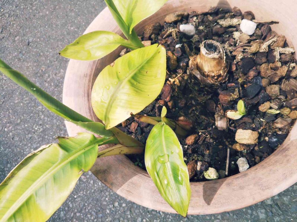 実生ミニバナナの鉢から脇芽が四つ。どれを残すか🤔