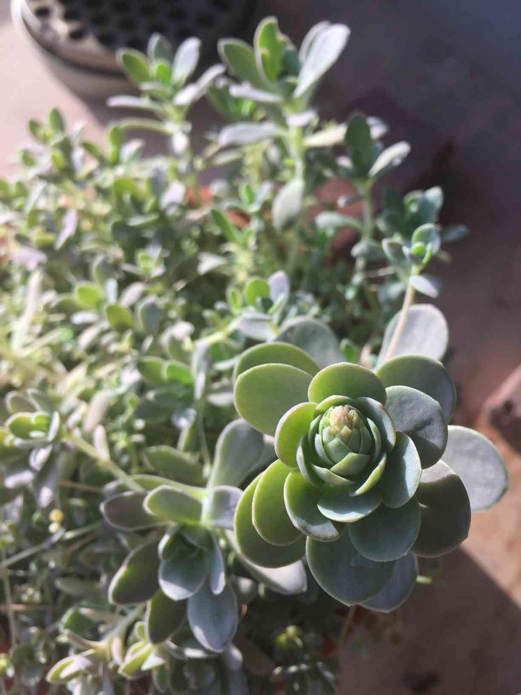 ちなみにのこ鉢、2階の窓の柵の多肉棚下段で冬を越したら徒長しちゃったもんで、日当たり良く無いけど庭の多肉棚の比較的光量の安定した場所に移動したら徒長止まったって感じかな?