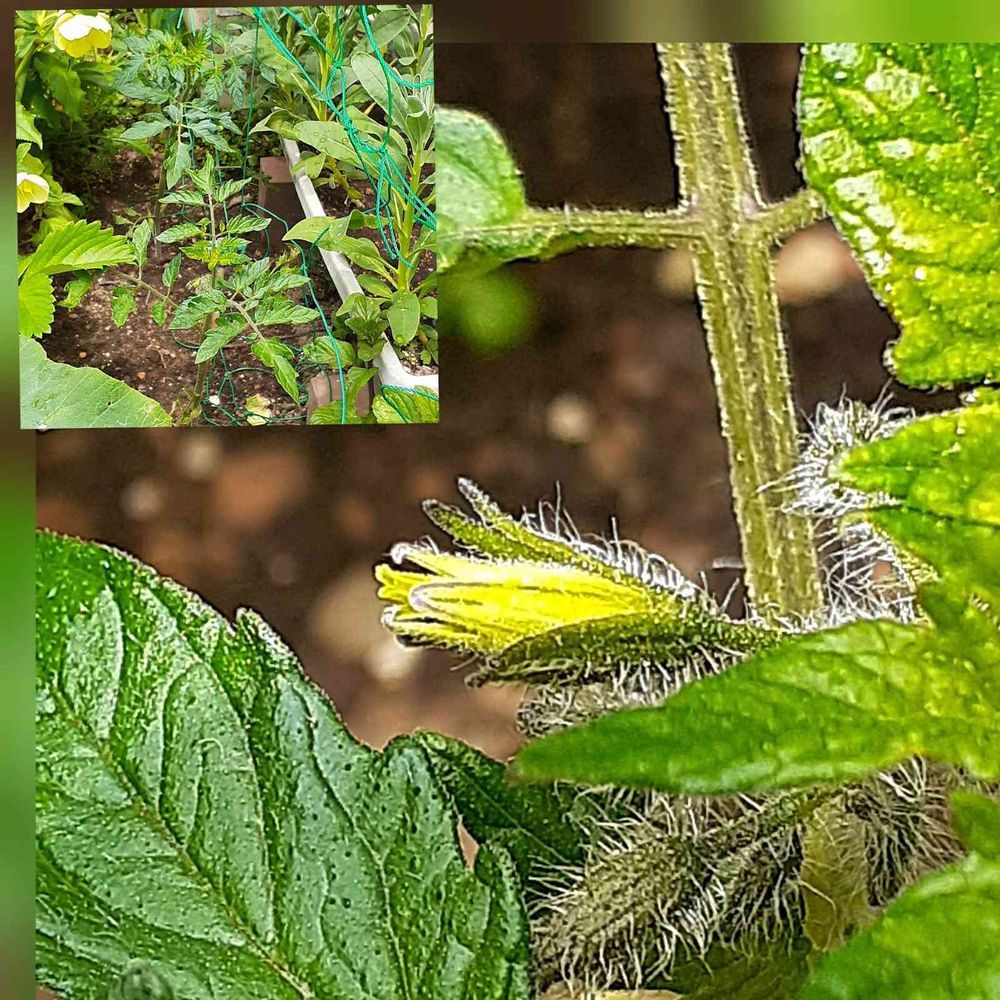 地植えして30cmほどになったトマトの苗の一つに一番花の蕾が出来ました。小さな蕾です。一番花は摘み取った方が良いのだったか?