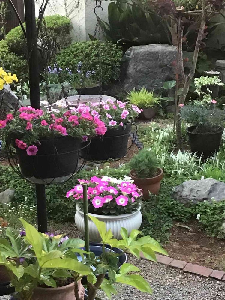 吊り鉢を 吊り下げる鉄製の ポールは、リフォーム会社の 営業所の お庭に ポツンと 置いてあった品で、もう 随分 前に 買いました‼︎ picでは